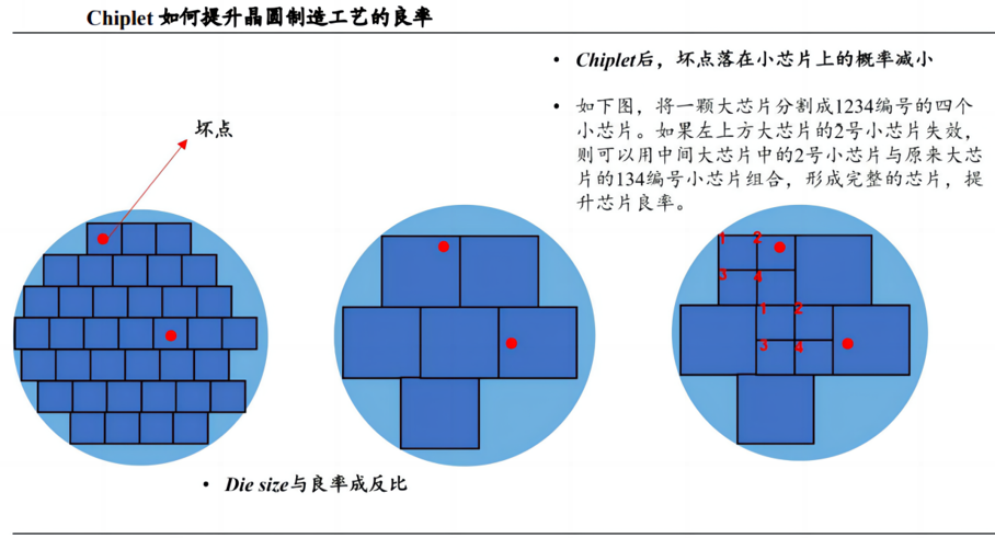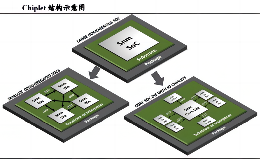 Chiplet即小芯片之意,指在晶圓端將原本一顆“大”芯片(Die)拆解成幾個“小”芯片(Die),因單個拆解后的“小”芯片在功能上是不完整的,需通過封裝,重新將各個“小”芯片組合起來,功能上還原原來“大”芯片的功能。Chiplet可以將一顆大芯片拆解設計成幾顆與之有相同制程的小芯片,也可以將其拆解成設計成幾顆擁有不同制程的小芯片。