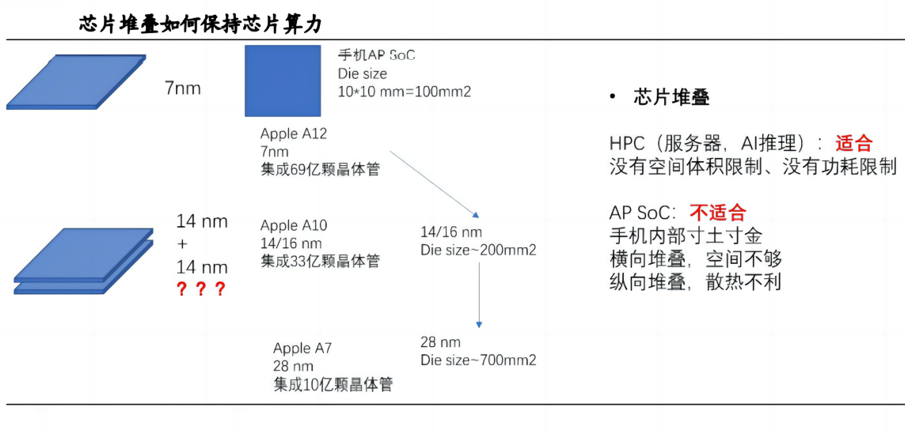 大功耗、高算力的場景,先進封裝/Chiplet有應用價值在先進制程不可獲得的情況下,通過芯片堆疊(先進封轉/Chiplet)和計算架構重構,以維持產品性能。以APPLE的A系列芯片參數為例,A12、A10、A7芯片分別采用7 nm、14/16 nm(Samsung 14 nm、TSMC 16 nm)、28 nm制程。A系列的手機AP芯片,通常芯片面積(Die Size)在約100 mm2大小。在這100 mm2大小的芯片上, A12、A10、A7芯片分別集成了約69億、33億、10億顆晶體管。下面,我們簡單進行算術換算,討論降制程如何維持芯片的算力。如果芯片工藝從7 nm降至14 nm,A12芯片上7nm工藝集成69億顆晶體管,如果用14 nm工藝以試圖達到接近的算力,首先要保證晶體管數目與A12芯片一致,即~70億顆,且在未考慮制程提升對單個晶體管性能有顯著提升的背景下,14 nm工藝的芯片需要兩倍于7 nm工藝的面積,即~200 mm2;如果芯片工藝從7 nm降至28 nm,參考28 nm的A7芯片只集成了10億顆晶體管,如果要達到70億晶體管數目,則需要將芯片面積擴大至~700 mm2。芯片面積越大,工藝良率越低,在實際制造中得到的單顆芯片的制造成本就越高,因此,在先進制程不可獲得的背景下,降制程而通過芯片堆疊的方式,的確可以一定程度減少算力劣勢,但是因為堆疊更多芯片,需要更大的IC載板、更多的Chiplet小芯片、更多的封裝材料,也導致因為制程落后帶來的功耗增大、體積/面積增加、成本的增加。因此,比如,通過14 nm的兩顆芯片堆疊,去達到同樣晶體管數目的7 nm芯片性能;通過多顆28 nm的芯片堆疊,去達到14 nm芯片性能。此種堆疊方案在HPC(服務器、AI推理)、基站類大芯片領域可能有適用價值,但對于消費電子領域如手機AP芯片和可穿戴芯片,在其應用場景對空間體積有嚴苛約束的條件下,芯片堆疊則較難施展。