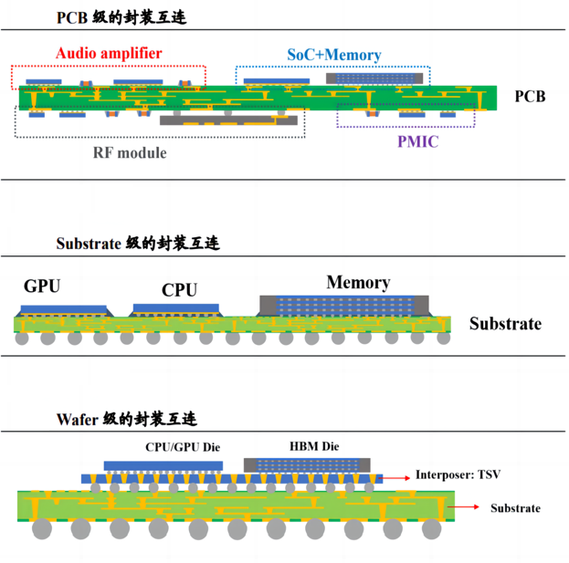 先進封裝是對應于先進圓晶制程而衍生出來的概念,一般指將不同系統集成到同一封裝內以實現更高效系統效率的封裝技術。換言之,只要該封裝技術能夠實現芯片整體性能(包括傳輸速度、運算速度等)的提升,就可以視為是先進封裝。傳統的封裝是將各個芯片單獨封裝好,再將這些單獨的封裝芯片裝配到PCB主板上構成完整的系統,芯片間的信息交換屬于PCB級的互連(interconnect),又稱板級互連;或者將不同的芯片貼裝到同一個封裝基板Substrate上,再完成系統級的封裝,芯片間的通訊屬于Substrate級的互連。這兩種形式的封裝互連技術,芯片間的信息傳輸需要通過PCB或Substrate布線完成。理論上,芯片間的信息傳輸距離越長,信息傳遞越慢,芯片組系統的性能就越低。因此,同一芯片水平下,PCB級互連的整體性能比Substrate級互連的性能弱。在摩爾定律失效之前,芯片系統性能的提升可以完全依賴于芯片本身制程提升(制程提升使得芯片集成晶體管數量提升)。但隨著摩爾定律失效,芯片制程提升速度大大放緩,芯片系統性能的提升只能通過不斷優化各個芯片間的信息傳輸效率,圓晶Wafer級封裝互連技術的價值凸顯。Wafer級的封裝互連技術,將不同的SoC集成在TSV(硅通孔技術:Through silicon via)內插板(interposer)上。Interposer本身材料為硅,與SoC的襯底硅片相同,通過TSV技術以及再布線(RDL)技術,實現不同SoC之間的信息交換。換言之,SoC之間的信息傳輸是通過Interposer完成。Interposer再布線采用圓晶光刻工藝,比PCB和Substrate布線更密集,線路距離更短,信息交換更快,因此可以實現芯片組整體性能的提升。圖XX示例為CoWoS封裝(Chip on Wafer on Substrate),CPU/GPU die與Memory die通過interposer實現互連,信息直接通過interposer上的RDL布線傳輸,不經過Substrate或PCB,信息交換快,系統效率高。從半導體制程進入10nm以來,摩爾定律已經失效,即芯片迭代不再滿足“集成電路芯片上所集成的晶體管數目,每隔18個月就翻一番;微處理器的性能每隔18個月提高一倍,而價格下降一倍”。在后摩爾定律時代,對于“more than moore”的延續,先進封裝是業界公認的有效途徑。