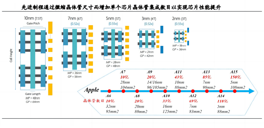 在芯片輕薄化方面,在不犧牲芯片整體性能的前提下,先進制程能夠在算力和晶體管數目不變時,通過縮小單個晶體管特征尺寸,實現芯片面積(Die size)縮小;而先進封裝,因為封裝對晶體管尺寸無微縮的能力,只能通過更精細的材料、更致密的結構來實現輕薄化。比如,手機AP處理器的封裝多采用FCCSP的封裝形式,其結構包括一個CSP載板,而Fanout(TSMC與APPLE公司合作,APPLE公司的A系列芯片多采用InFO技術封裝,即Fannout)封裝,取消了CSP載板(CSP載板約0.3 mm厚度),封裝后的芯片更輕薄,對整機(手機)結構空間余量有重要提升。